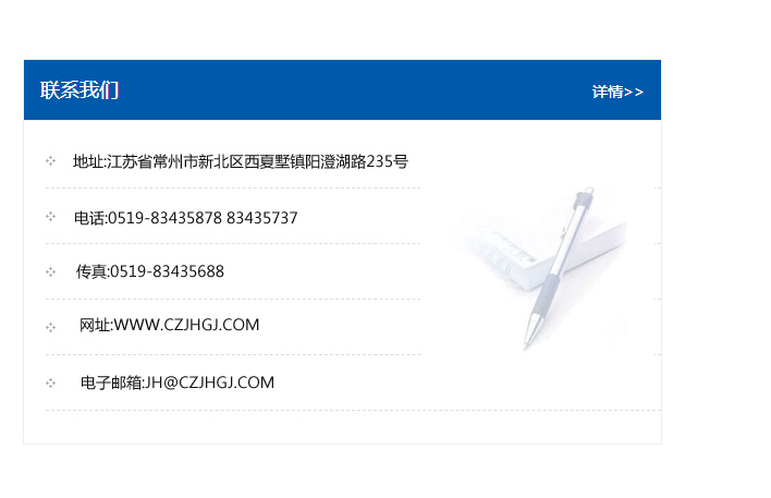 地址:常州市新北區友邦商務大廈1幢16、17層  電話:0519-85101652  傳真:0519-85112595  郵編:213022  網址:www.cz-jiayue_cn.vrlisty.com  郵箱:xiajifengaa@163.com